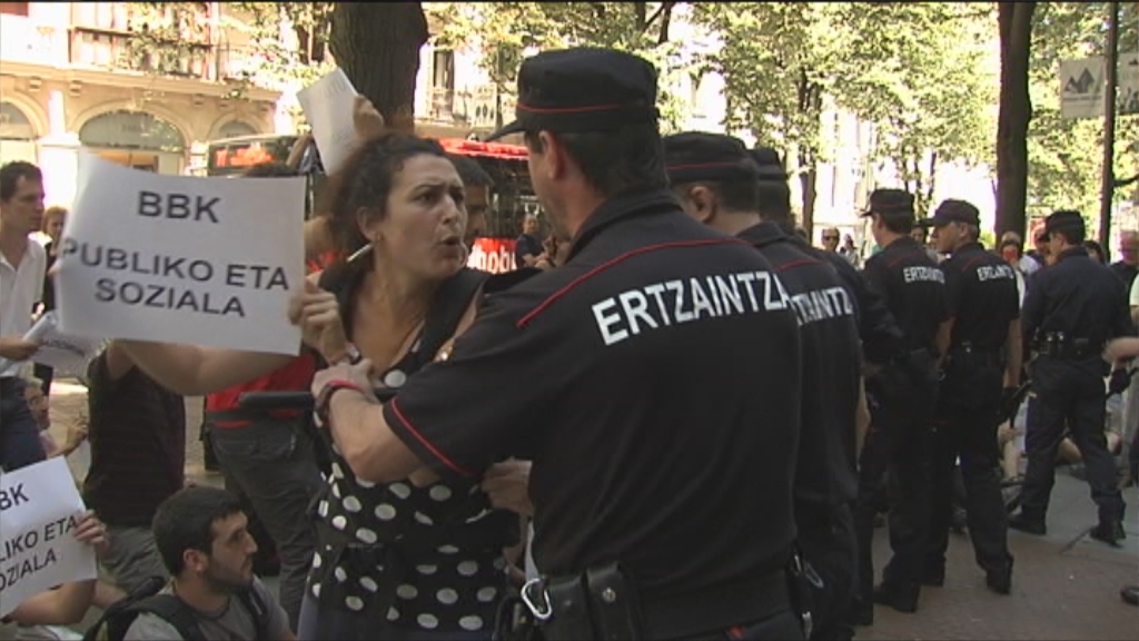 Dos centenares de personas se han concentrado este lunes en la Gran Vía de Bilbao convocados por EH Bildu, ELA y LAB mientras entraban en la sede de la BBK los asambleístas que esta tarde votan la conversión de la caja vizcaína en una fundación bancaria.