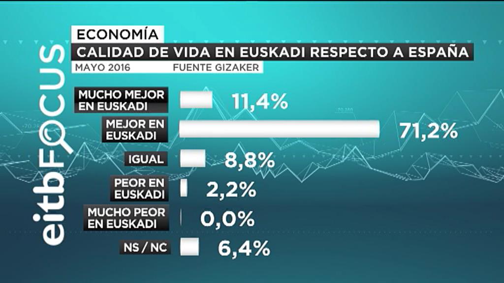 La ciudadanía vasca cree que se vive mejor en Euskadi que en España, aunque peor que en Europa, ya que el 82,4% de los encuestados creen que la calidad de vida es mejor en Euskadi que en España y 40,6% peor que en Europa, según se desprende de la tercera entrega de la segunda macroencuesta de 'EiTB Focus'.
