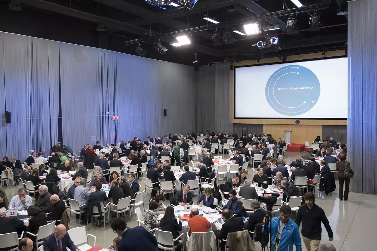 Al primer encuentro de la Comunidad del Concierto, celebrado en la sala Multibox de la sede de EiTB en Bilbao, han acudido más de 300 personas que, en torno a unas 40 mesas redondas, en grupos de 7 u 8 personas, han debatido cómo se podría conseguir que el Concierto Económico sea más conocido y reciba más apoyo de la sociedad vasca.