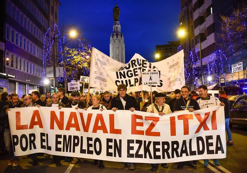 Tras una pancarta con el lema "La Naval ez itxi. Por el empleo en Ezkerraldea", los manifestantes han coreado distintas consignas contra el cierre del astillero, reclamando la implicación de los Gobiernos vasco y de España para evitar su cierre definitivo.