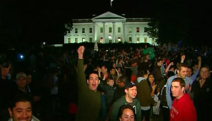 Sin embargo, a medida que fueron pasando los minutos, una mayor multitud se fue agrupando en el área, donde se podían ver descorches de botellas y carteles que decían "Obama 1-Osama 0", al tiempo que se gritaba con fuerza "USA, USA".