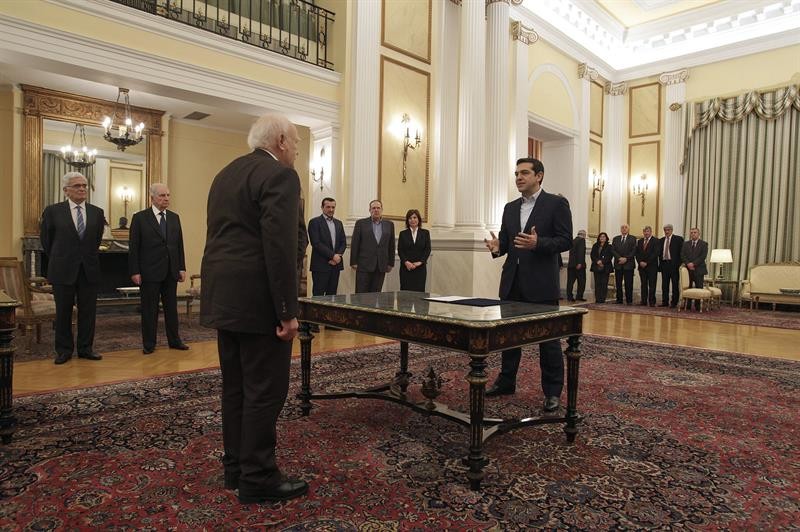 El líder de Syriza ha jurado hoy mismo el cargo de primer ministro, tras llegar a ese acuerdo con la derecha nacionalista, y convirtiéndose así en el primer ministro más joven de la historia helena. Tsipras ha acudido a las 15:00 horas a la presidencia de la República para jurar ante el jefe de Estado, Károlos Papulias.