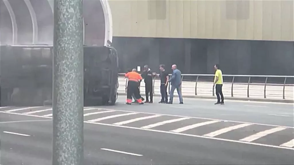 Un grupo de ciudadanos ayuda al conductor del camión a salir de la cabina