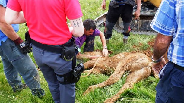 Agentes de la Policía Foral y ganaderos de la zona consiguieron extraer al potro con la ayuda de una máquina excavadora.