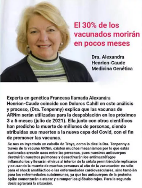Tanto Sheri Tenpenny como la genetista Alexandra Henrion-Caude, han sido reconocidas por varios portales internacionales como propagadoras de desinformación relacionada con las vacunas del covid-19.