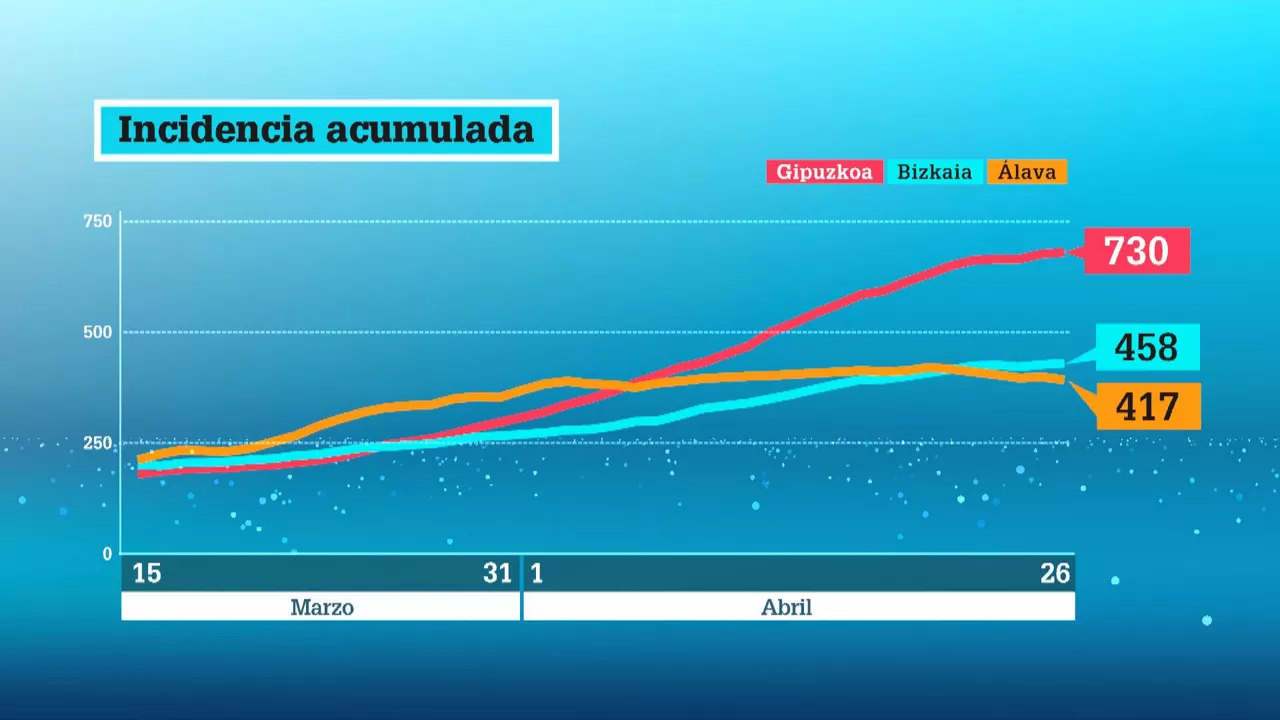 En las capitales, Vitoria-Gasteiz mantiene una buena tendencia y vuelve a descender su incidencia acumulada a 426,8 casos. Bilbao la aumenta hasta los 582,1 y San Sebastián, la de peor evolución, llega a los 606,3.