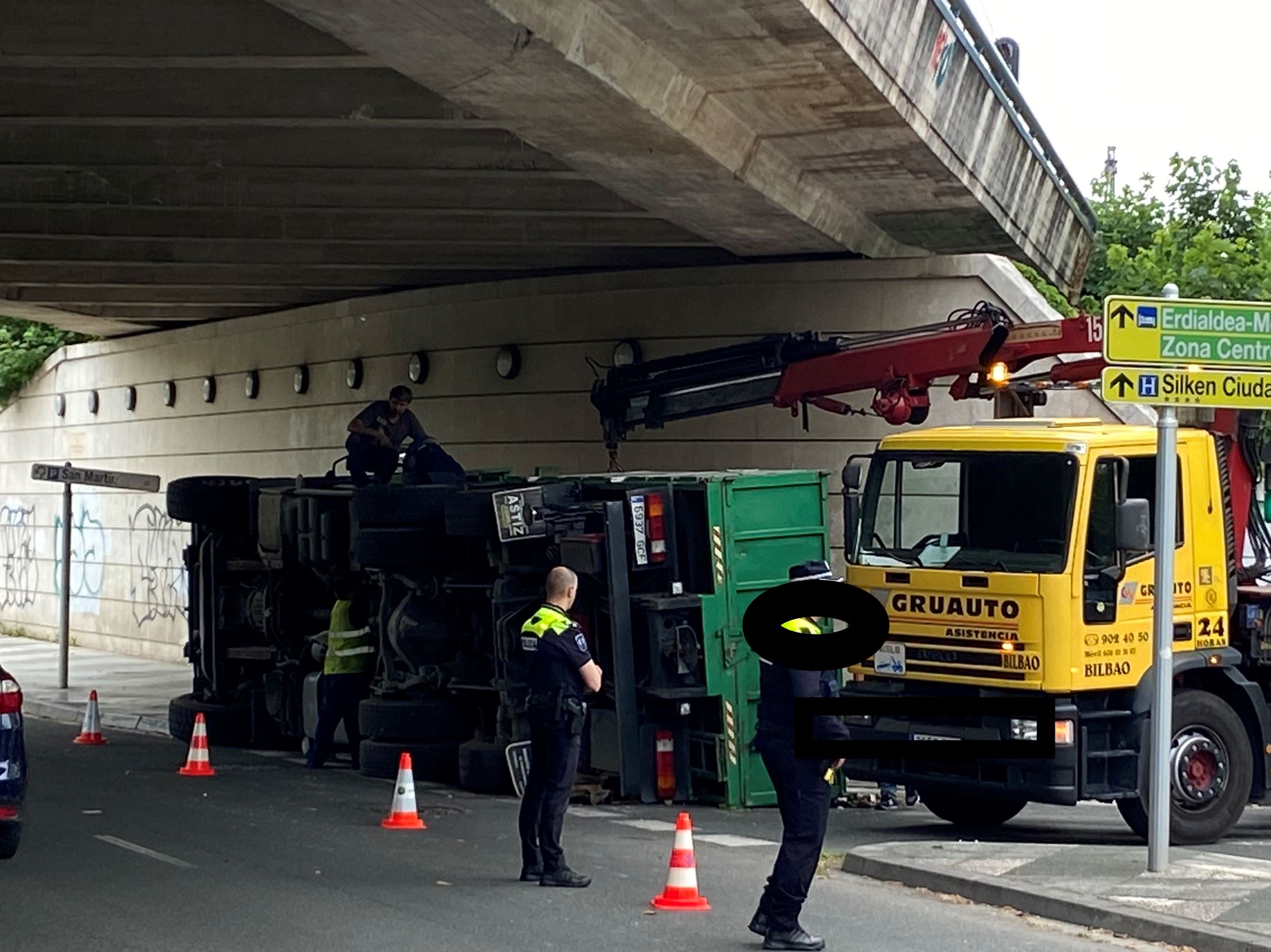 Vuelca un camión pluma tras sufrir un golpe con el puente azul de la calle Portal de Castilla