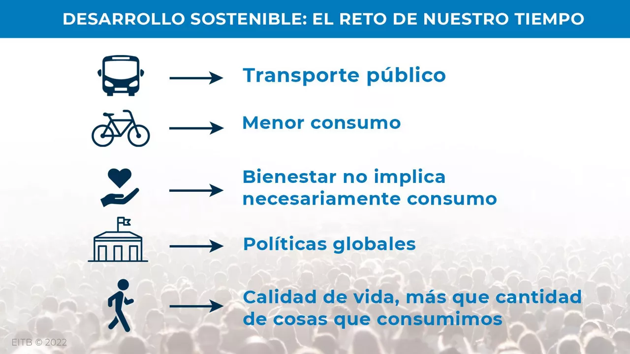 "Tenemos que cambiar el chip", subraya el investigador de Ikerbasque en BC3, que nos anima a entender que "bienestar no implica necesariamente consumo de cosas". Stefano Balbi recuerda pequeños gestos que podemos hacer cada día, como apostar por el transporte público y, en general, tratar de consumir menos, pero resume de nuevo de una forma muy gráfica lo que aconseja: "Buscar la calidad de la vida más que la cantidad".