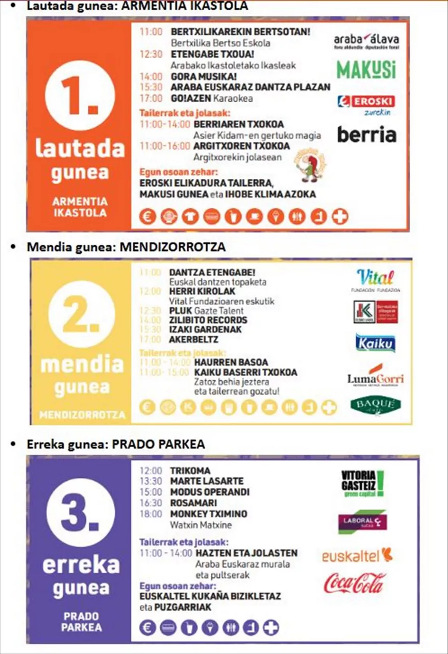 La huelga indefinida que están llevando a cabo los jardineros de Vitoria-Gasteiz ha obligado a cambiar la ubicación original (campas de Olarizu). Sin embargo, la fiesta de las ikastolas alavesas ha mantenido tanto la fecha (15 de junio) como la programación.