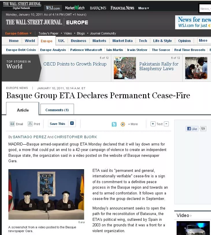 Walt Street Journal lleva la noticia a mitad de su portada de Europa. Cuenta que el "grupo vasco armado separatista ETA declaró el lunes que va a dejar las armas para siempre, pero el gobierno español rechazó este anuncio".