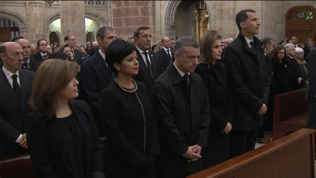 11:45 Los cuatro lehendakaris están ya en la Catedral de Santiago, así como los príncipes de Asturias y la vicepresidenta del Gobierno español, Soraya Sáenz de Santamaría. Los consejeros del Gobierno vasco y representantes de todos los partidos vascos han llegado ya, así como los diputados generales. En el interior de la iglesia, se encuentra el hijo de Azkuna, Alex, junto con el resto de familiares del alcalde fallecido.