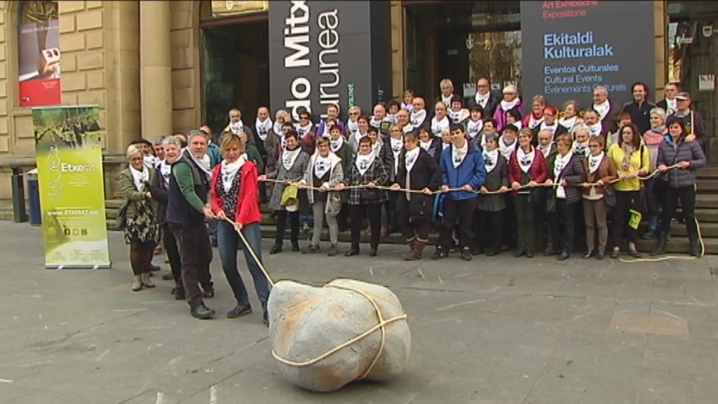 Momentos antes de esta rueda de prensa, varias decenas de miembros de Etxerat han posado ante la fachada del edificio del centro cultural Koldo Mitxelena de San Sebastián, donde han colocado un gran obstáculo de cartón-piedra que han simulado mover entre todos con una gran cuerda, en alusión al lema de las manifestaciones del próximo 9 de enero: "¡Que se muevan las piedras!".
