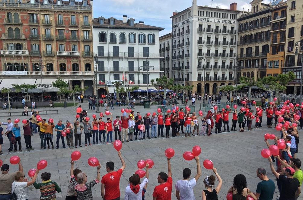 La iniciativa, bajo el lema 'El futuro es nuestro' y en la que ha participado más de un millar de personas, según los organizadores, se ha desarrollado en un ambiente festivo, dirigido desde el kiosco por un joven que iba dando las instrucciones para que los presentes ocuparan los espacios ya marcados previamente en el suelo y después agitaran los globos rojos que se han repartido.