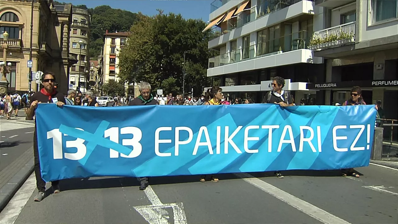 La manifestación ha comenzado a las 13:30 horas de este domingo, día en el que se han disputado las regatas de la Bandera de La Concha, en el Boulevard de la capital donostiarra encabezada por una pancarta con el lema "13/13 Epaiketari ez".