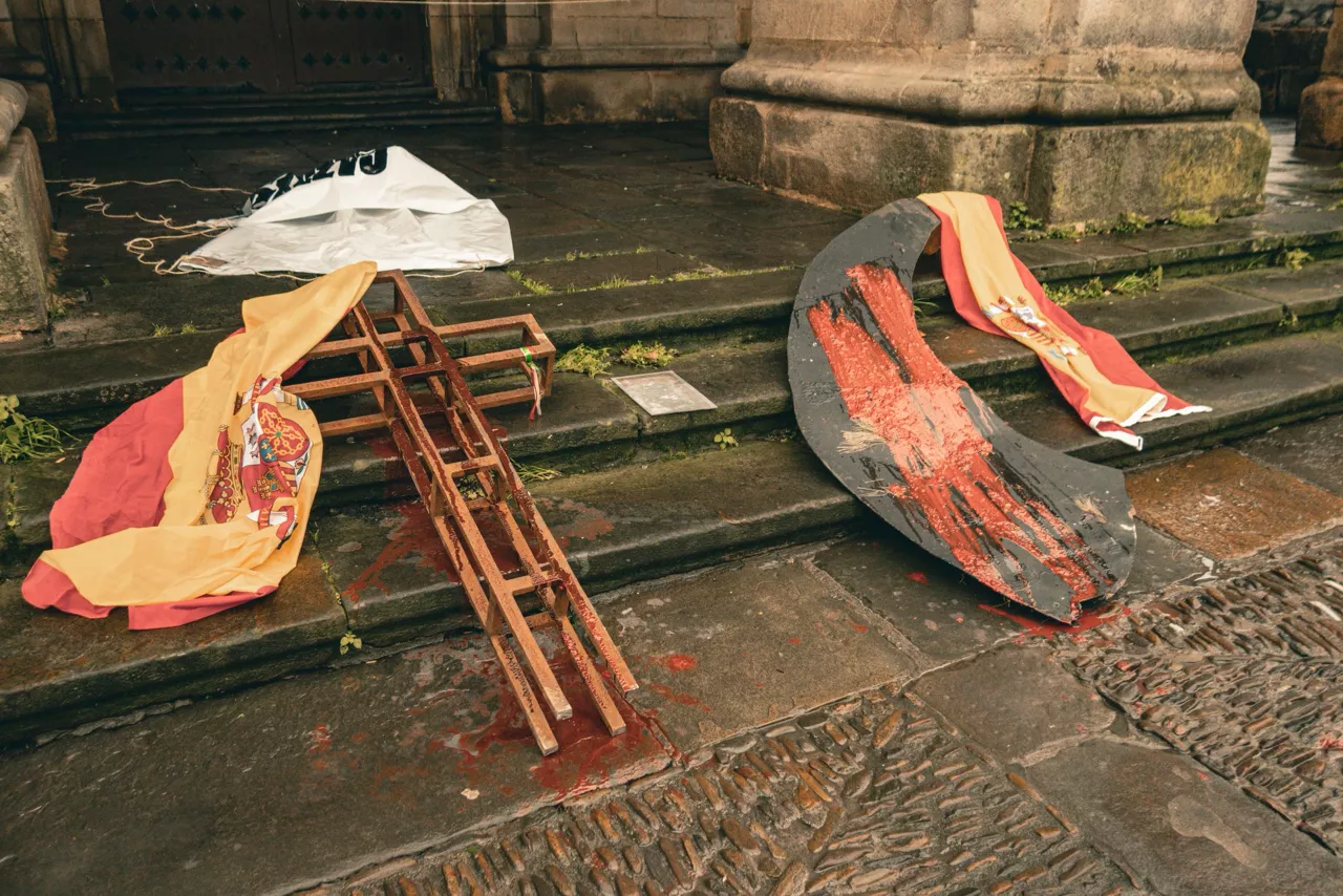 Así, en la plaza de Santa Ana de Durango (Bizkaia) se han depositado los símbolos o fragmentos de los mismos que fueron retirados o derribados esta semana: los cuernos del toro Osborne de Tudela (Navarra), la cruz en honor a un militar carlista en Igeldo (Gipuzkoa), la placa de la calle con el nombre del alcalde franquista de Vitoria-Gasteiz y las banderas españolas de diferentes edificios públicos de Euskal Herria.