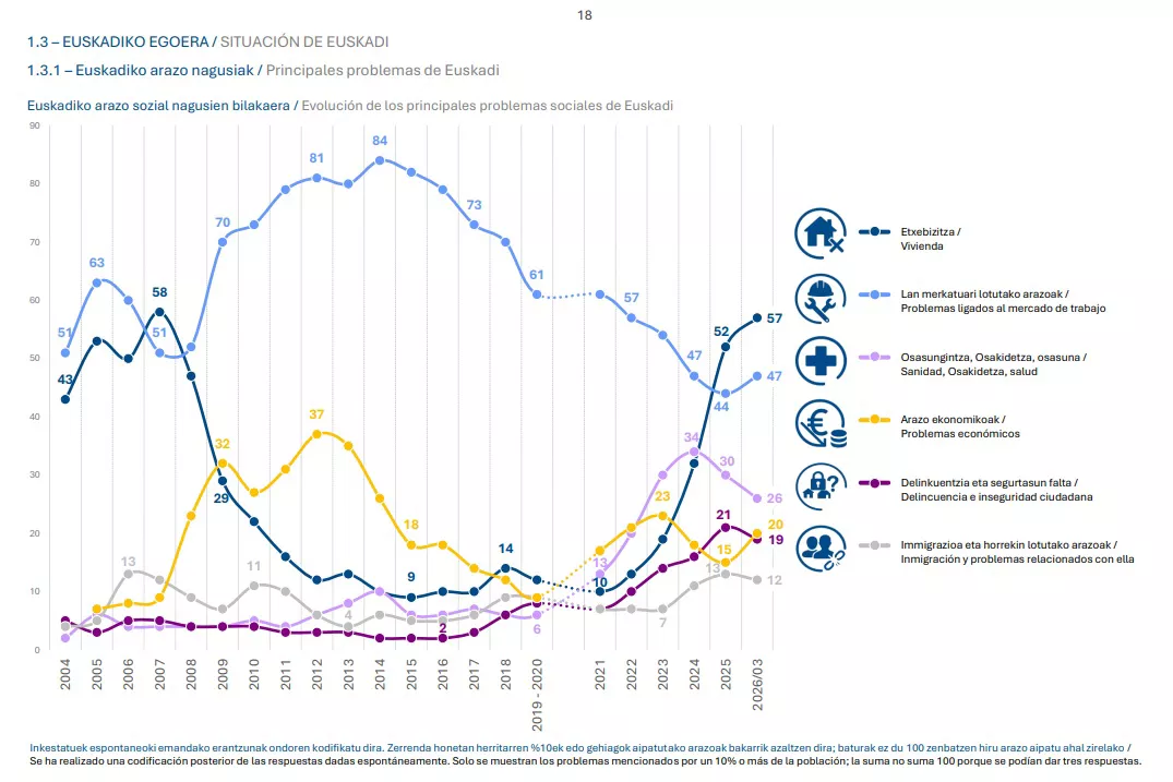 Por tanto, vivienda (57 %), ‘problemas ligados al mercado de trabajo’ (47 %), Sanidad (26 %), ‘problemas económicos’ (20 %) y delincuencia (19 %) aparecen como los cinco principales problemas de la sociedad vasca, mientras que la inmigración queda fuera de esos cinco primeros puestos y se sitúa en sexto lugar.