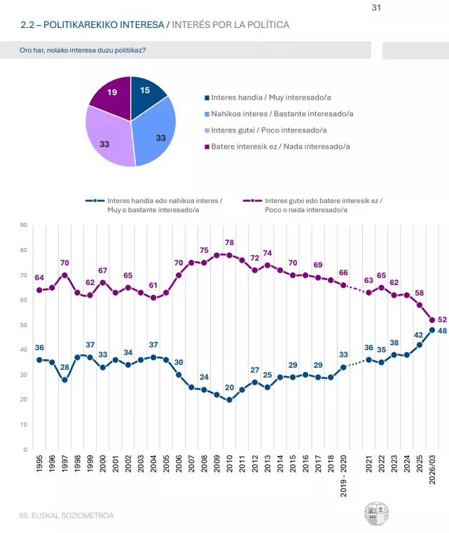 Como es habitual, el Sociómetro también pregunta por otras cuestiones ligadas a la ‘situación personal’ de los encuestados o por las ‘actitudes políticas’. En este último apartado, llama la atención el incremento del interés por la política, que alcanza su pico histórico: el 48 % de los encuestados se muestra ‘muy o bastante interesado’. En 2010, cuando se alcanzó el punto más bajo, esa cifra se situaba en el 20 %.