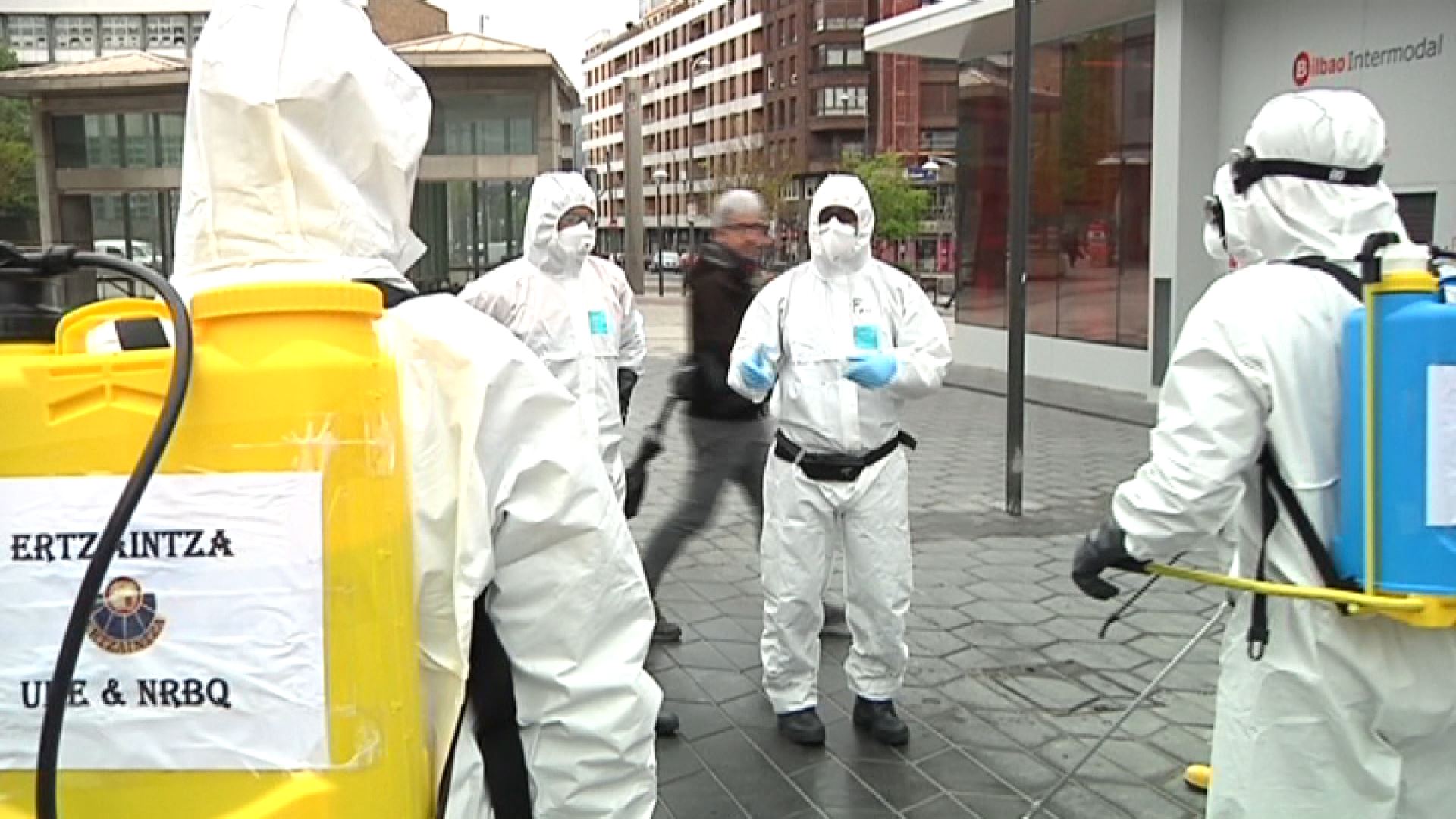 Miembros de la Ertzaintza especializados en riesgos biológicos han desinfectado la estación Intermodal de Bilbao. Ataviados con trajes protectores han limpiado tanto el exterior como el interior.