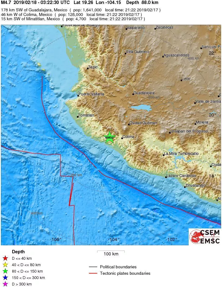 El seísmo se ha producido a 46 km al oeste de Colima, a 88 kilómetros de profundidad.