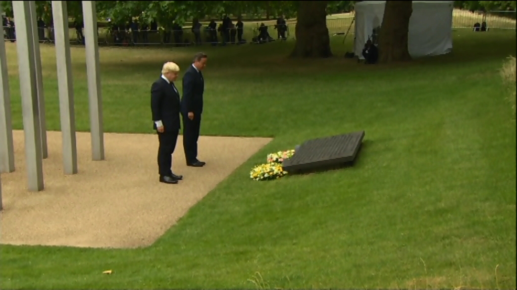 El primer ministro David Cameron y el alcalde de Londres Boris Johnson han realizado una ofrenda floral en el monumento por las 56 personas muertas en los ataques de 2005.