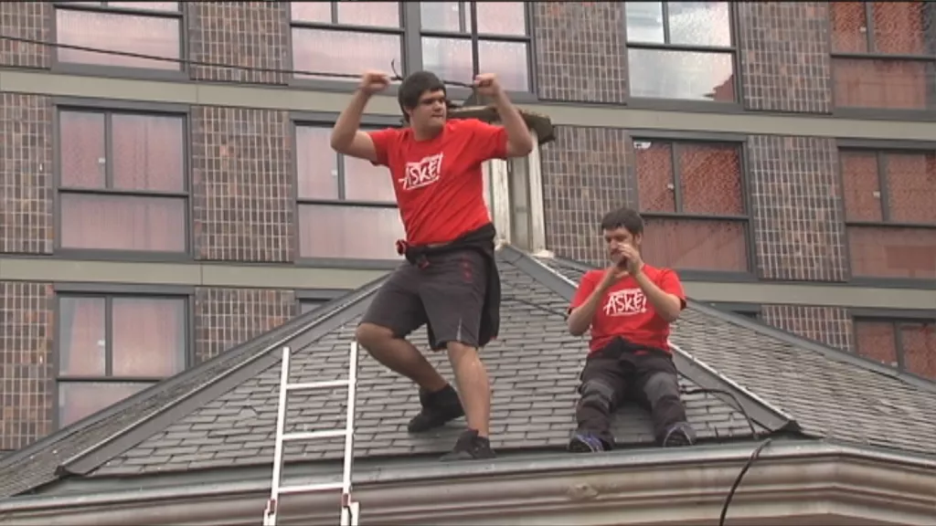 Ante decenas de personas que los han arropado, los dos jóvenes se han subido al tejado de un kiosko en Deusto. Han puesto una escalera para subirse al tejado en el que se han encaramado.