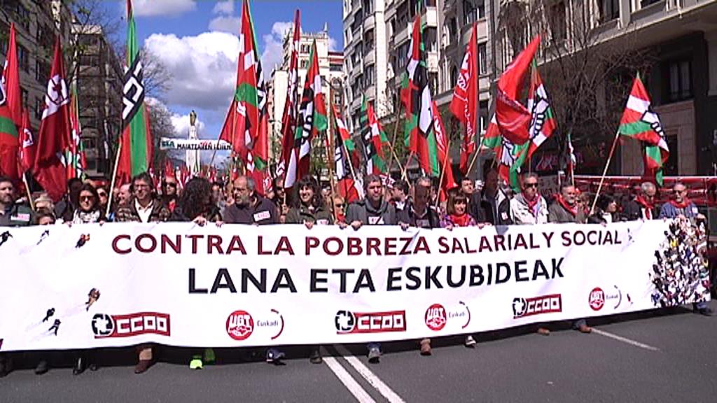 Bajo el lema 'Contra la pobreza salarial y social', los sindicatos CCOO y UGT han denunciado la precariedad laboral en la manifestación de esta mañana, en Bilbao.