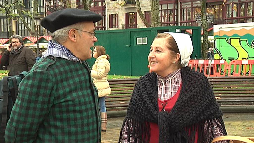 El buen tiempo anima a mucha gente a visitar la feria de Santo Tomás, en el Arenal y la Plaza Nueva de Bilbao, y aprovechar para comprar productos de la tierra y el tradicional talo con chorizo.
