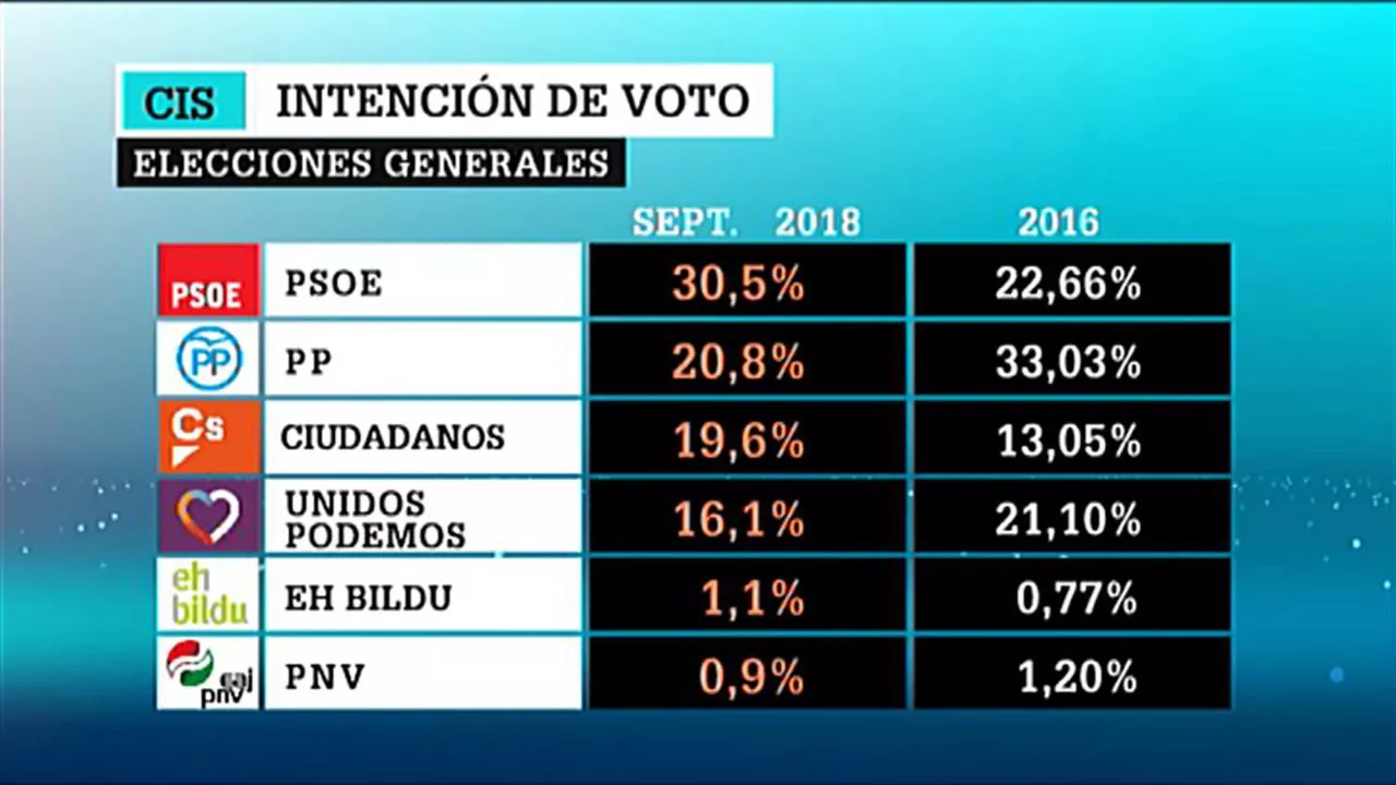 Es el primer CIS desde que Pablo Casado está al frente de los populares y no consigue remontar. Pisándole los talones se mantiene Ciudadanos, y, cuarto, con el 16 % de los votos, sigue Unidos Podemos.