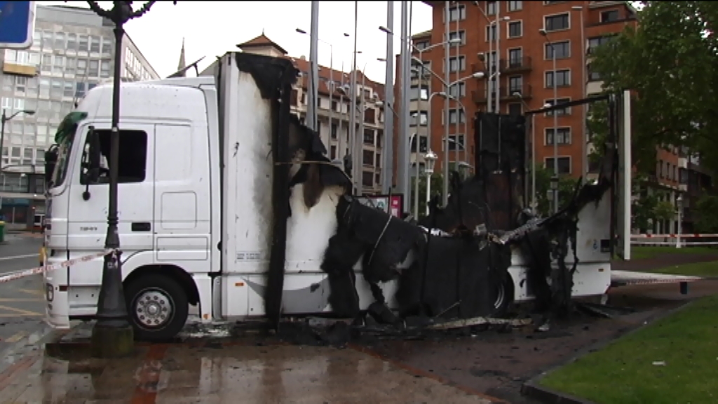 Un camión queda calcinado frente al museo de Bellas Artes de Bilbao
