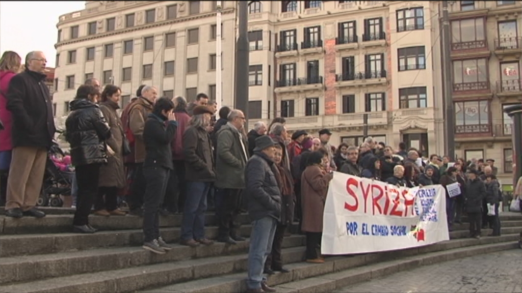 La plataforma a favor al cambio en Grecia, 'Syrizarekin', se ha concentrado frente al teatro Arriaga de Bilbao, con el objetivo de mostrar su apoyo a Syriza.