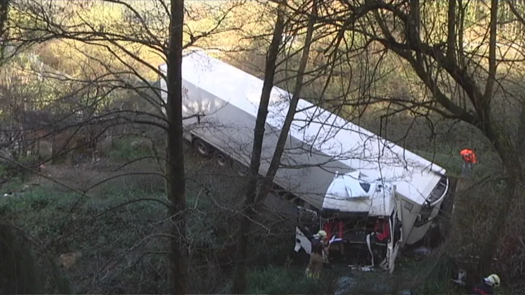 Un trailer ha chocado contra un coche que se encontraba detenido en el arcén, para cambiar una rueda, ha perdido el control y ha caído por un terraplén.