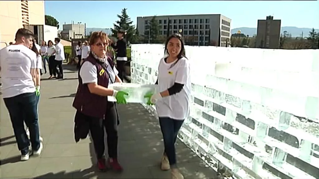 Con 400 bloques de 20 kilos cada uno, unos 80 voluntarios han construído una escultura de hielo en la Universidad de Navarra. Buscan derretir o disolver los límites entre el arte y la vida, han dicho