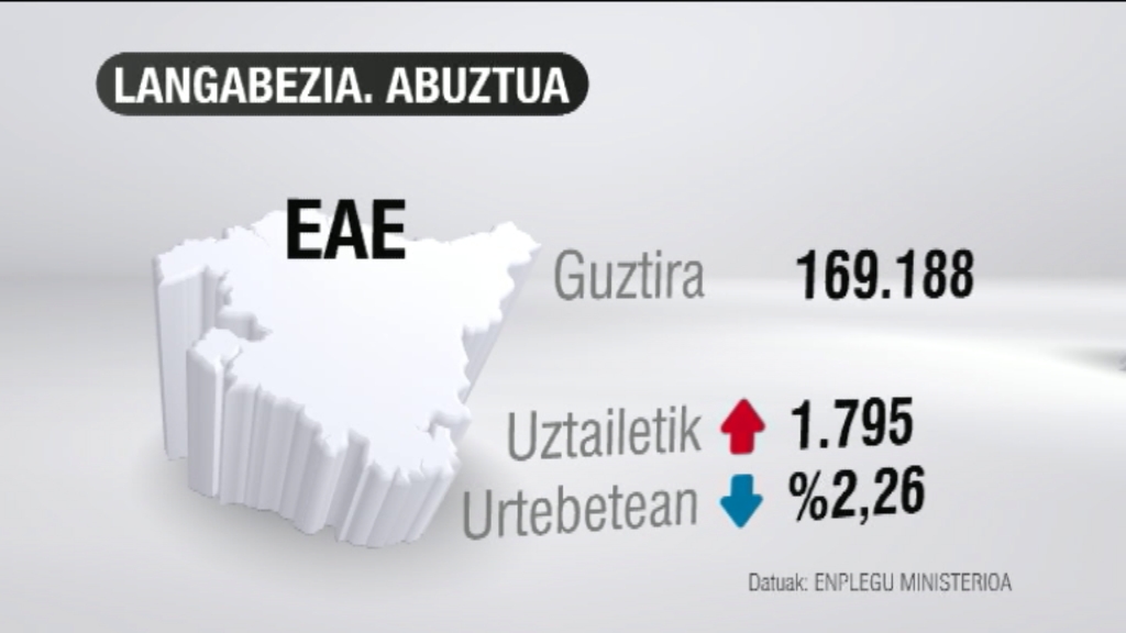 Langabeziak gora egin du berriro EAEn. Abuztuaren amaieran 169.188 langabe zeuden Araban, Bizkaian eta Gipuzkoan; hau da, uztailean baino 1.795 gehiago (% 1,07), Espainiako Enplegu eta Gizarte Segurantzako Ministerioak jakitera eman duenez. 2013ko abuztuko datuekin alderatuta, 3.919 langabe gutxiago daude; % 2,26 gutxiago, hain zuzen ere.