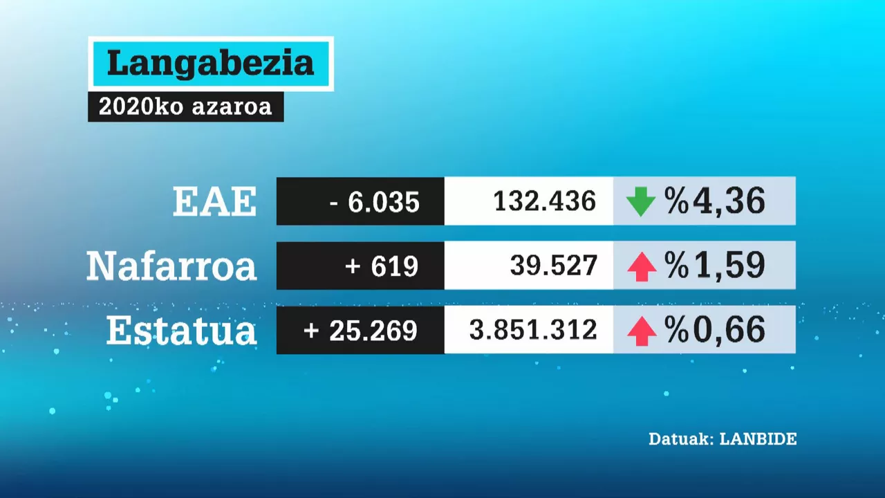 Aurreko urtean baino 15.078 langabe gehiago zenbatu dituzte EAEn 2020an, baina abenduan 3.196 pertsona gutxiago daude lanik gabe aurreko hilabetearekin alderatuta, Enplegu Zerbitzu Publikoen Bulegoetan jasotako datuen arabera. Nafarroan, bestalde, 7.439 langabe gehiago daude, eta, beraz, langabezia % 22,41 hazi da 2020an.