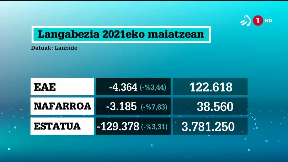 Asteazken honetan Lan eta Gizarte Ekonomiako Ministerioak emandako datuen arabera, EAEn 2020ko maiatzean baino 19.097 pertsona langabe gutxiago daude, hau da, orduko 141.715 baino % 13,48 gutxiago. Hala ere, langabe kopurua (122.618) Covid-19aren pandemia hasi aurrekoa baino altuagoa da, 2020ko otsailean 117.239 langabe baitzeuden.