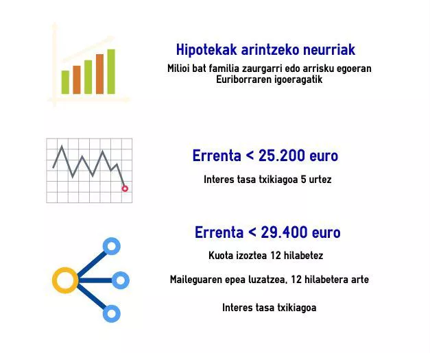 Ildo horretan, onartutako neurriek hiru arlotan ezarriko dituzte: alde batetik, "familia zaurgarrien tratamendua hobetuz"; bigarrenez, "beste denbora jarduketa bat zabalduz, interes tasen igoeragatik zaurgarritasun arriskuan dauden familientzat"; eta, azkenik, "kredituen aurreratutako amortizazioa errazteko eta hipotekak tasa finko bilakatzeko neurriak hartuz".