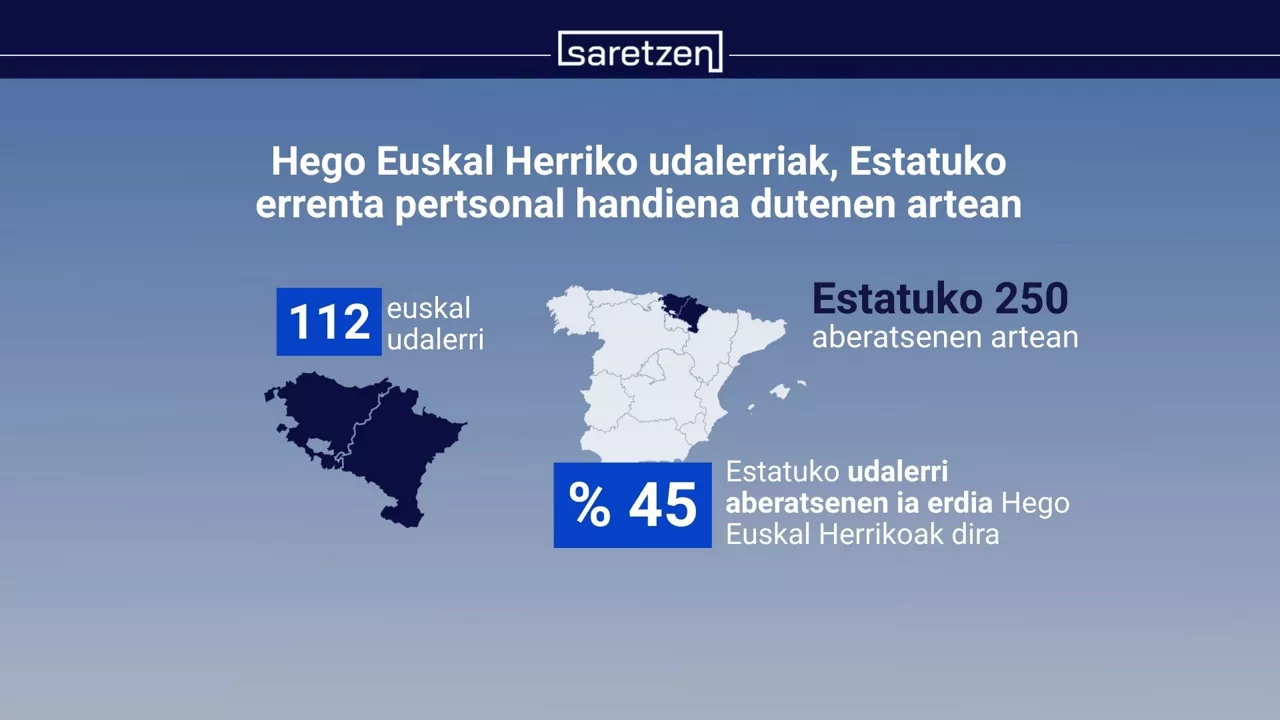 Estatu osoan batez besteko errenta pertsonal handiena duten 250 udalerrietatik, 112 Hego Euskal Herrikoak dira; hau da, Estatuko udalerri aberatsenen % 45 euskal udalerriak dira.