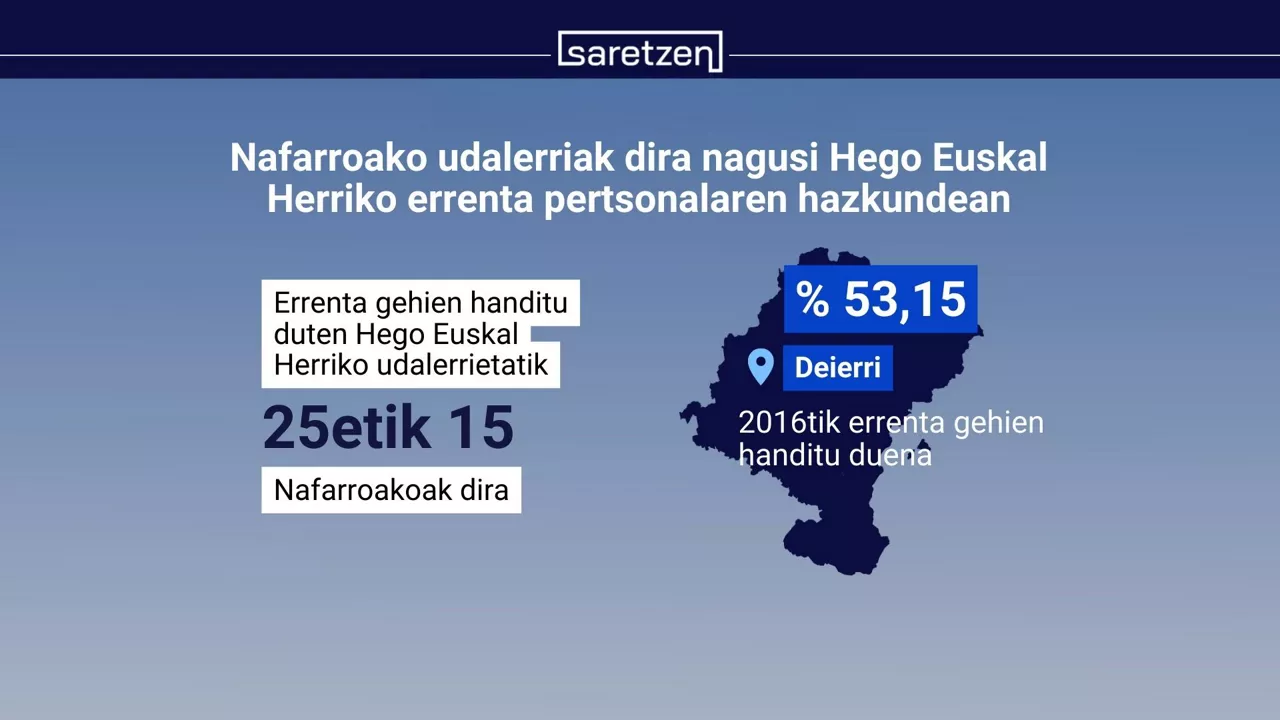 Mapa xehe aztertuta, baina, Nafarroako udalerriak dira hazkundearen buru gurean. Izan ere, Espainiako Estatistika Institutuaren Familien Errenta Banaketaren Atlasaren azken datuen arabera (2023), 2016tik errenta pertsonalaren hazkunderik handiena izan duten Hego Euskal Herriko 1.000 biztanletik gorako 25 udalerrietatik 15 Nafarroan daude.