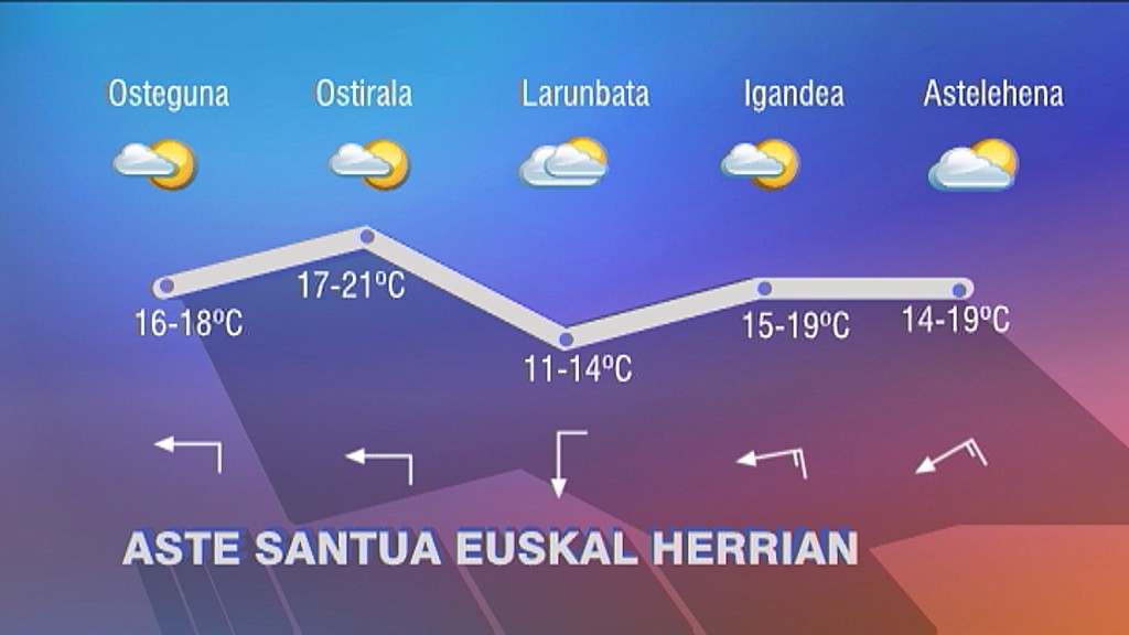 Ostiralean ere, giro atsegina izango da, eta zerua urdin egongo da. Larunbatean kaskartuko da aroa, goizaldean fronte bat sartu, eta lainoak utziko ditu zeruan. Euria ere bota dezake ipar isurialdean, txikia bada ere. Hala, apirilaren 4a izango da Aste Santuko egunik txarrena, eguraldiari dagokionez. Lurraldearen hegoaldean ateri eutsiko dio; beraz, euritik ihes egin nahi dutenek Arabara edo Nafarroara jo beharko dute. Tenperatura, berriz, dezente freskatuko da.