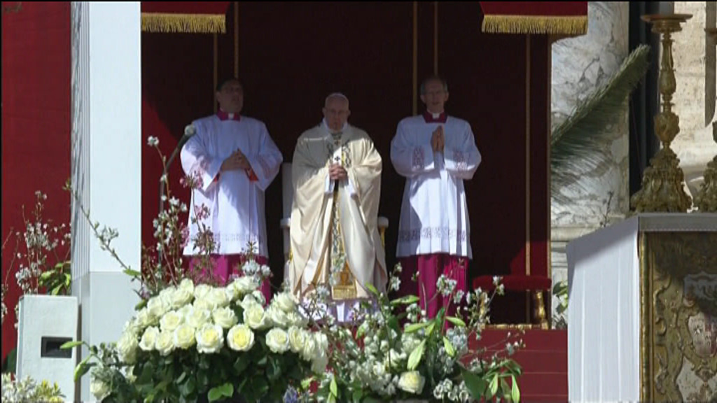 San Petri basilikako balkoira igota, Pazko igandeko mezua irakurri du eta "Urbi eta Orbi" bedeinkazioa eman du. Errefuxiatuei dagokienez, etorkizun hobea bilatzen duten pertsona horiek hartzea defendatu du aita santuak.