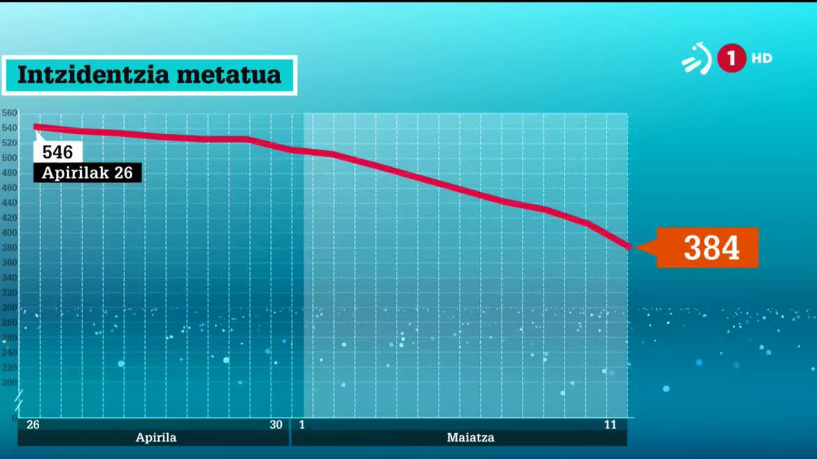 100.000 biztanleko 14 egunetan metatutako kasu positiboen tasa jaitsi egin da Euskadin asteartean, beheranzko joerarekin jarraituz, 384,78 kasura iritsita, hau da, astelehenean baino 18 puntu gutxiago (402,51). Horrela, Euskal Autonomia Erkidegoak 'eremu gorria' alde batera utzi du.