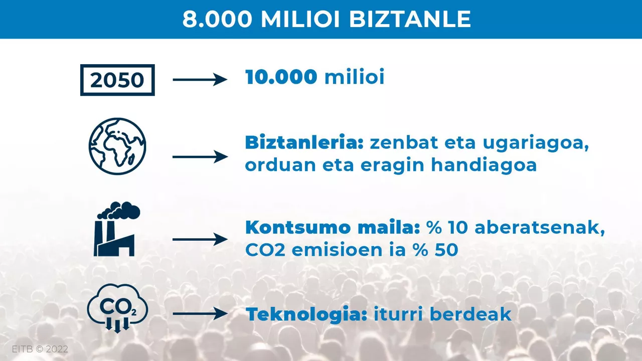 Asteartean, hilak 15, Lurrak 8.000 milioi biztanleko muga gainditu du; hala kalkulatu du NBEk "Munduko Biztanleriaren gaineko Ikuspegiak 2022" txostenean. Ildo horretan, eitb.eus-ek jakin nahi izan du ea gure planetak biztanleria kopuru horri aurre egiteko adina baliabide natural dituen, ala, alderantziz, baliabide horiek agortzen ari diren, eta Lurrarentzat ezinezkoa den biztanleriaren gorakadari eustea.