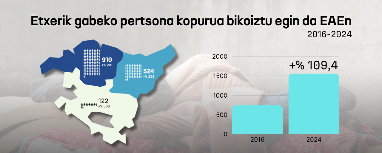 Etxerik gabeko pertsonen kopurua bikoiztu egin da EAEn, eta 1.500 baino gehiago ziren 2024an