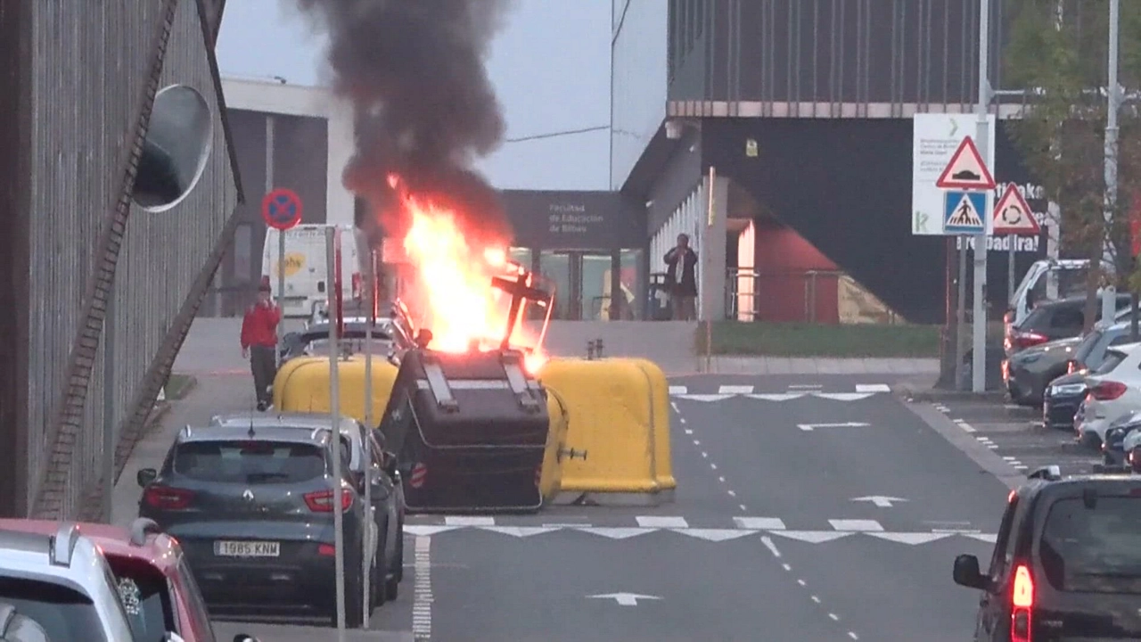 Identifikatu ez duten talde batek edukiontzi bat erre dute eta beste batzuk gurutzatu ditu EHUko campusean, Leioan. Errektoretza taldeak iragarri du "lehenbailehen" jarriko direla harremanetan "unibertsitateko oinarri etikoak urratu dituztenekin".