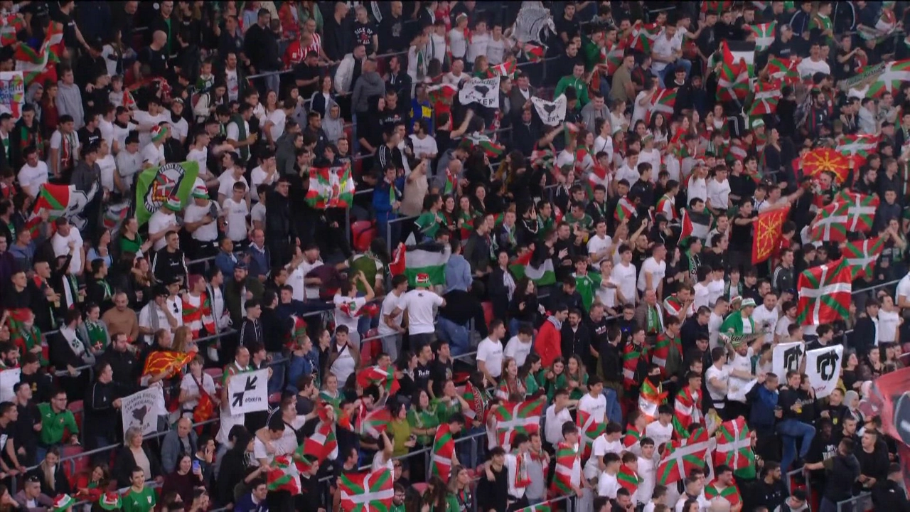 Eta Athleticeko jokalariek partiden amaieran egin ohi duten bezala, bi selekzioetako futbolariak San Mameseko animazio harmailen aurrean gelditu dira eta Mikel Laboaren 'Txoria Txori' abestu dute guztiek elkarrekin.