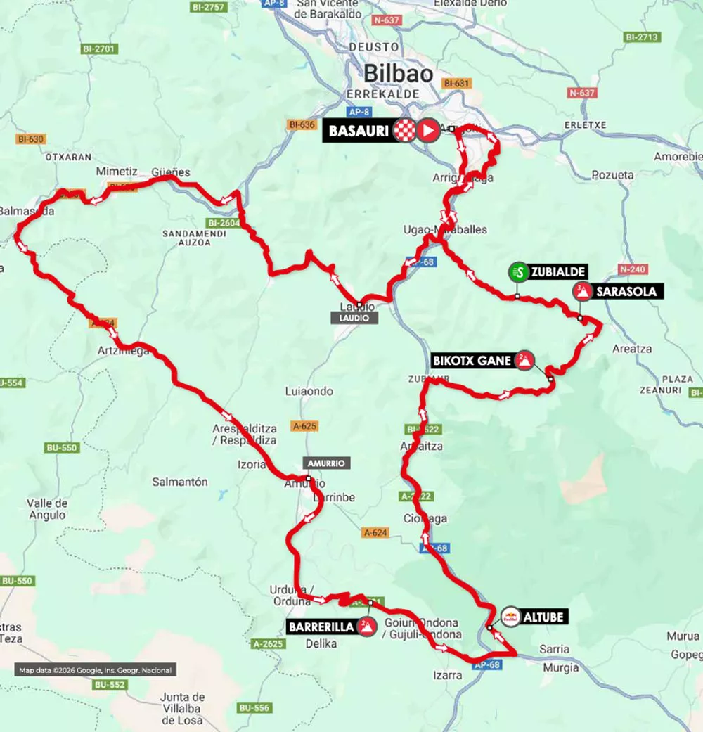 Horrekin batera, udalerrietan mozketak izango dira. Etapa Basaurin hasiko da, 13:30ean, eta gero Laudio eta Soduperantz egingo du. 51,8. kilometroan Artziniegara helduko da, eta hortik aurrera etapako hiru mendatetarantz egingo du: lehenengo, Barrerilla; gero, Bikosgana; eta, azkenik, Sarasola. Basaurira iritsi aurretik, Itzulia Elexalde-Zaratamotik igaroko da.