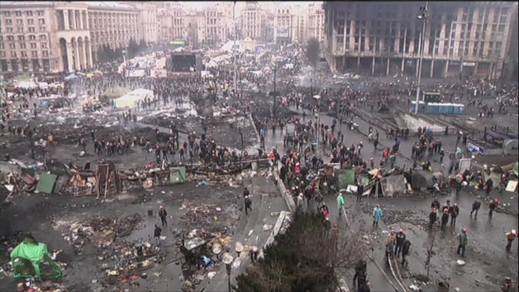 Manifestarien eta polizien arteko borroka bortitzak gaur goizean hasi dira berriz, atzo Viktor Janukovitx Ukrainako presidenteak eta oposizioak tregoa adostu bazuten ere. 12 ordu baino ez du iraun lasaitasunak.
