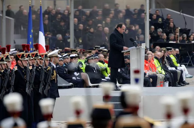 Emozioz beteriko hitzaldia eman du Hollandek. "Azaroaren 13a sekula ahaztuko ez dugun eguna" izango dela azpimarratu du, "hiltzaile talde batek 130 pertsona hil eta ehunka zauritu" zituelako "arrazoi zoro eta traizionatutako jainko baten izenean".