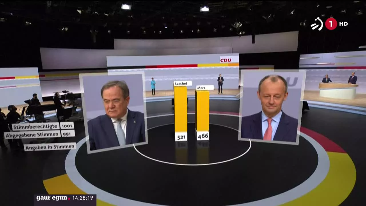 Laschet, alderdiko presidenteordea, Merzen atzetik sailkatu da lehen itzulian, baina bigarren bozketan 521 boto erdietsi ditu. Merzek, ostera, 466 boz eskuratu ditu. Merz Angela Merkel kantzilerraren etsai historikoa da.