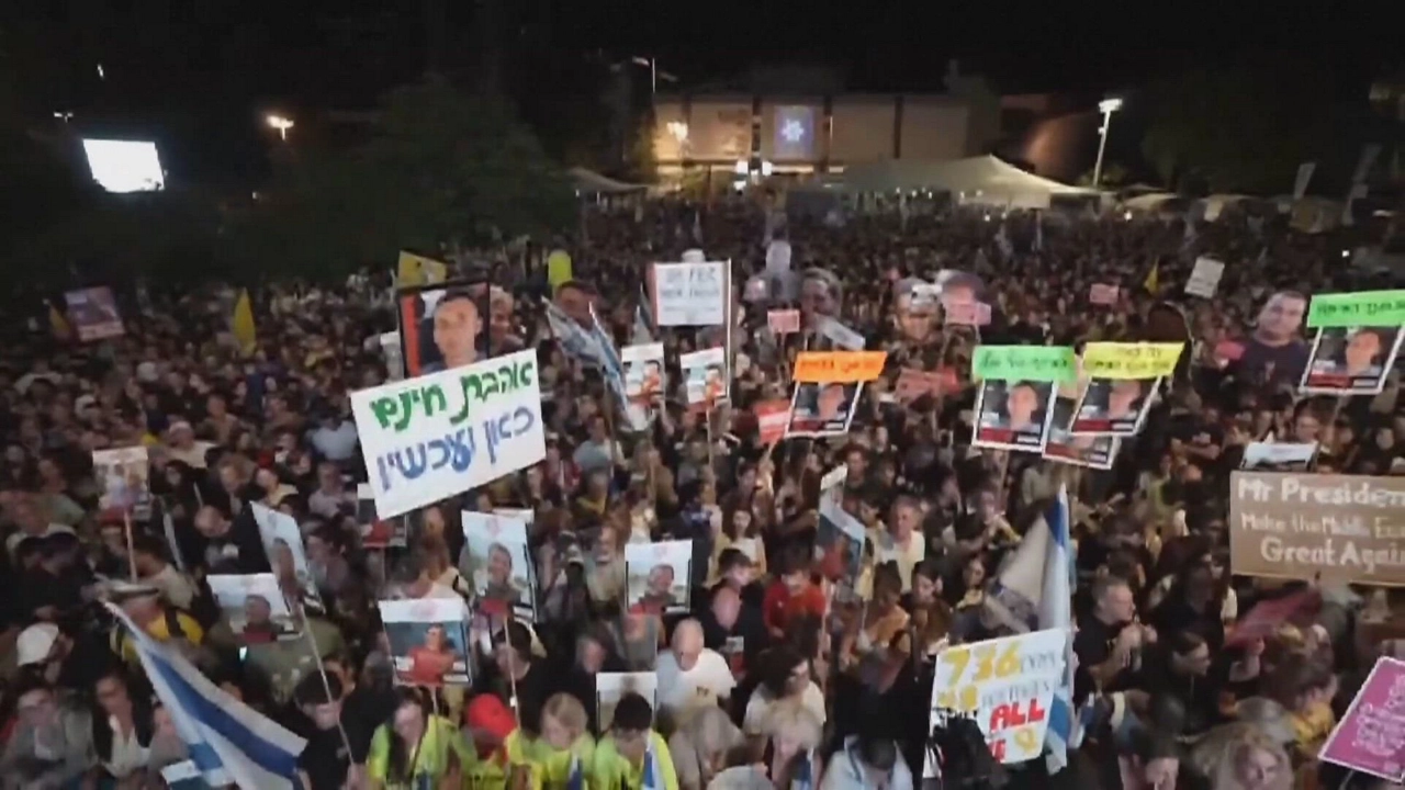 Gaurkoan, jendetza bildu da Bahituen Plazan familiei babesa emateko. Kontzentrazioan pertsona esanguratsuak ere izan dira, hala nola AEBetako ordezkari berezia Ekialde Hurbilean, Steve Witkoff, eta Donald Trumpen suhia, Jared Kushner. Berauek senideekin partekatu dute eszenatokia.